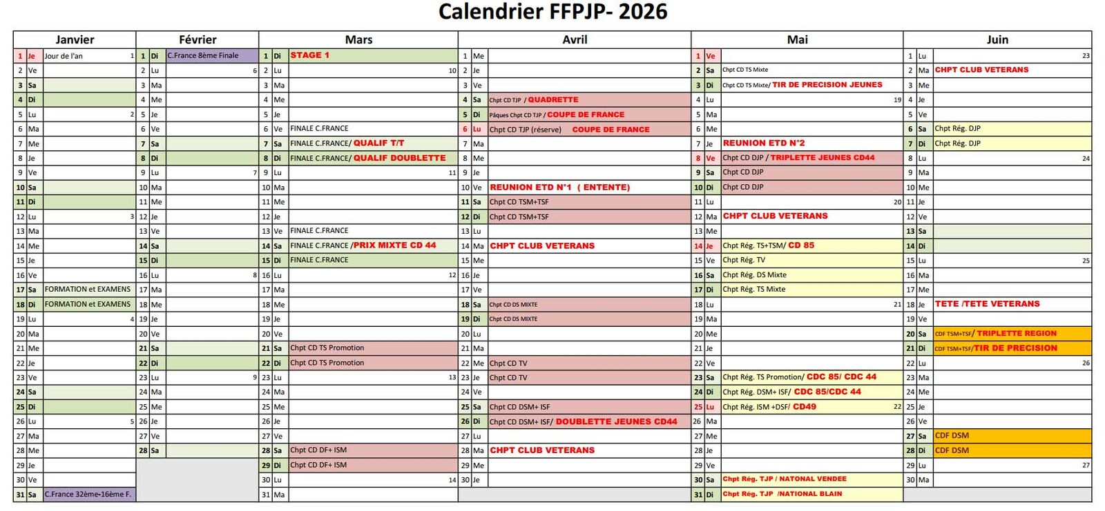 Vous trouverez ci-après les premières dates 2026 à retenir: 14 et 28 Avril Championnat Vétéran. 12 Mai Championnat Vétéran. 2 Juin Championnat Vétéran. 6 Septembre Championnat open. 27 Septembre Championnat open. 4 Octobre Championnat open. 18 Octobre Championnat open. Les tournois et/ou concours organisés par l'ACC PETANQUE: Les 7 et 8 Mars, le14 Juin et le 24 Septembre Nous aurons besoin de chacun d'entre nous pour l'organisation de ces journées. Prenez donc date. Merci, Dominique